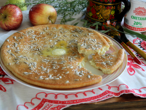 Взбейте яйца, перемешайте с молочными продуктами и с мукой. Налейте тесто в форму, посыпьте семечками и запекайте толстый блин в духовке.