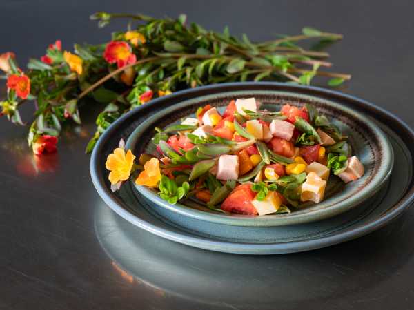 Перед вами весь набор ингредиентов, который необходим для приготовления салата из рукколы, мангольда и шпината.