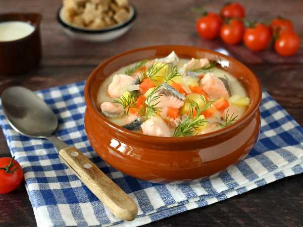 Соберите все необходимые продукты для приготовления супа с семгой и плавленым сыром.
