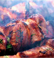 Несколько рецептов приготовления шашлыка![]() ![]() все рецепты шашлыков на сайте IamCOOK.ru Шашлык традиционный из баранины: ![]() Очищаем мясо от плёнки и жира и нарезаем кусочками по 40 — 50 г, солим, перчим, добавить репчатый лук, нарезанный кольцами. Затем всё это перекладываем в эмалированную посуду, к уксусу посыпать сахар, размешать и залить этим раствором мясо. Положить на мясо груз и мариновать в холодном месте около суток. Когда мясо замаринуется, очистить его от лука, насадить на шампуры плотно друг к другу, примять и жарить над раскаленными углями, постоянно поворачивая, чтобы на шашлыке образовалась румяная корочка, а внутри мясо оставалось розовым. Во время жаренья шашлык постоянно сбрызгивать маринадом. Подавать шашлык рекомендуется на подогретом блюде, полив шашлычным соусом. Отдельно — рассыпчатый рис, смешанный с подрумяненным в масле мелко нарезанным репчатым луком, а также кусочки маринованного репчатого лука. Шашлык "По-узбекски". ![]() Мякоть баранины нарезать кусочками по 15 — 20 г сложить в неокисляющуюся посуду, добавить нашинкованный репчатый лук, винный уксус, анис, красный перец, перемешать и, уплотнив, оставить в холодном месте на 3 — 4 ч. Перед жаркой кусочки подготовленной таким образом баранины нанизать на металлические шпажки по 4 — 5 кусочков на одну шпажку вперемежку с кружочками сырого репчатого лука, посыпать пшеничной мукой, на конец каждой шпажки насадить по кусочку курдючного сала и жарить над раскаленными углями. Подать сразу же после жарки на шпажках (3 шпажки на порцию). В качестве гарнира можно подать нашинкованный сырой репчатый лук и зелень петрушки. Шашлык из куриного мяса. ![]() ![]() ![]() |