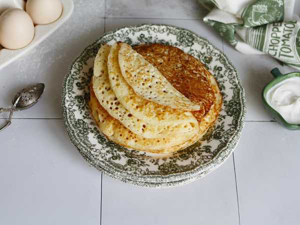 Все ингредиенты для приготовления блинов на сметане и дрожжах соберём по списку.