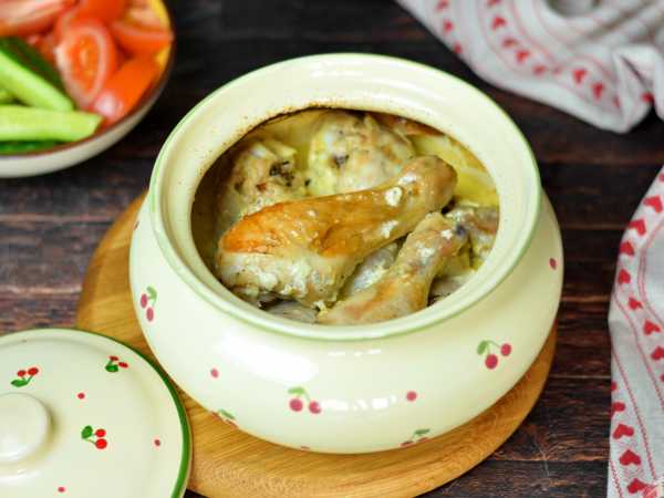 Для того чтобы запечь куриные голени в горшочке в духовке, возьмите, ...