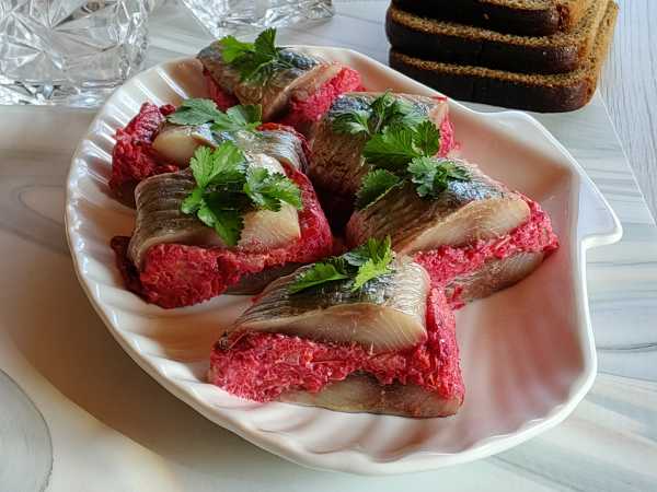 Канапе «Селедка под шубой» на черном хлебе можно создать буквально за несколько минут до подачи на стол, если у вас под рукой есть уже отваренные и охлажденные овощи.