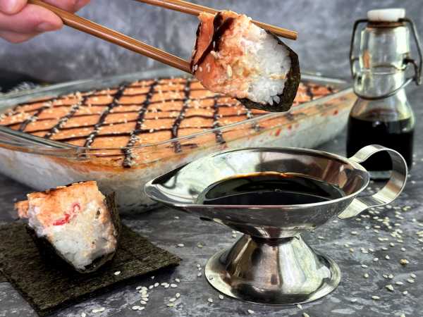 Собрать продукты для приготовления запеченных ленивых суши с крабовыми палочками.