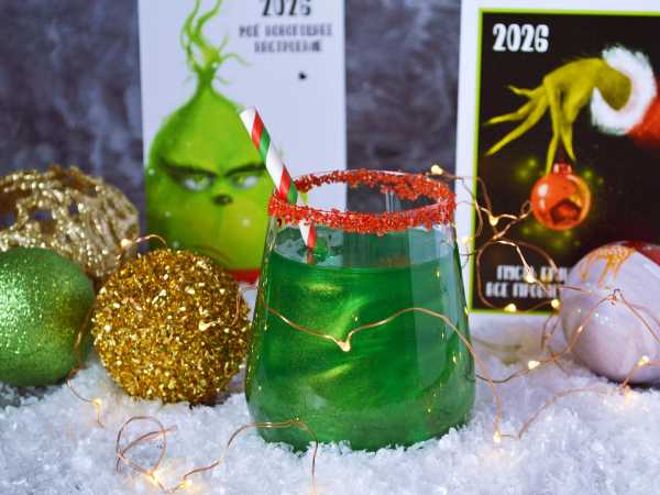 Соберите необходимые ингредиенты для приготовления новогоднего моктейля «Гринч». Напитки заранее хорошо охладить.