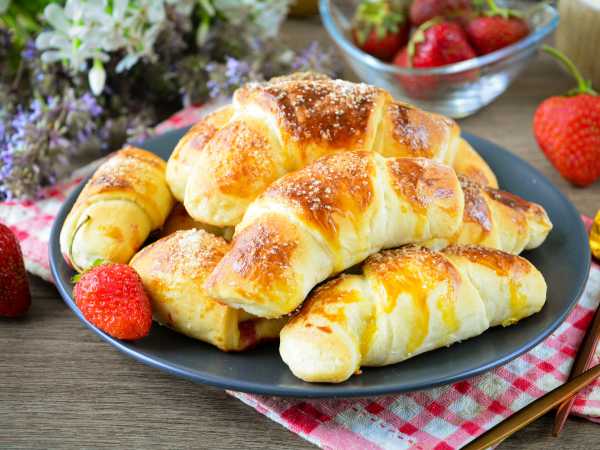 Замешиваем дрожжевое тесто. Создаём из него рогалики, в качестве начинки используем мармелад. Выпекаем в духовке в течение 20-30 минут.