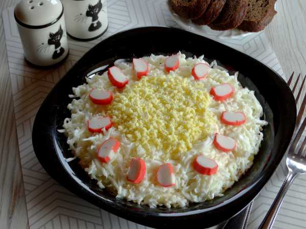 Простой по составу слоеный салат с майонезом и крабовыми палочками. Нежный сырно-крабовый вкус с хрустящими чипсами.
