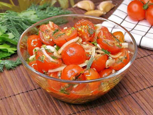 Подготовим продукты для салата. Для его приготовления лучше всего подойдут помидоры черри, но если их нет, подойдут и обычные помидоры. Луковицу берём маленькую, но если лук крупный, хватит и половинки. ...