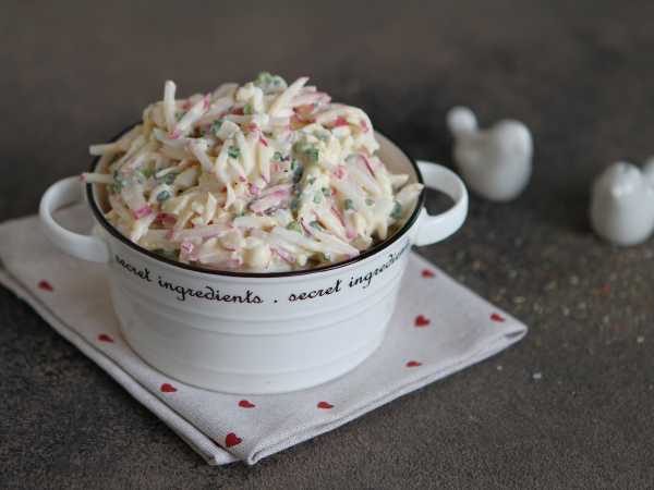 Для приготовления салата «Крабовая шуба» соберите необходимые ингредиенты по списку. Яйца заранее отварите и остудите.