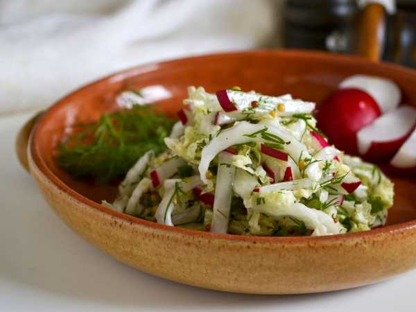 Соберите продукты для приготовления салата из капусты к шашлыку. Редиску, свежую зелень вымойте и обсушите.