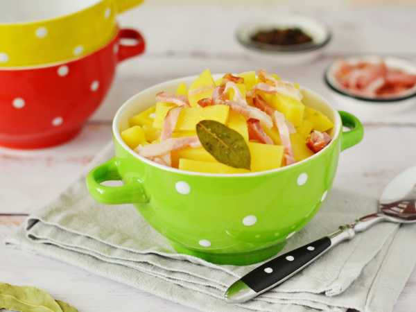 Готовить тушеную картошку с беконом лучше в глубокой толстостенной посуде ...