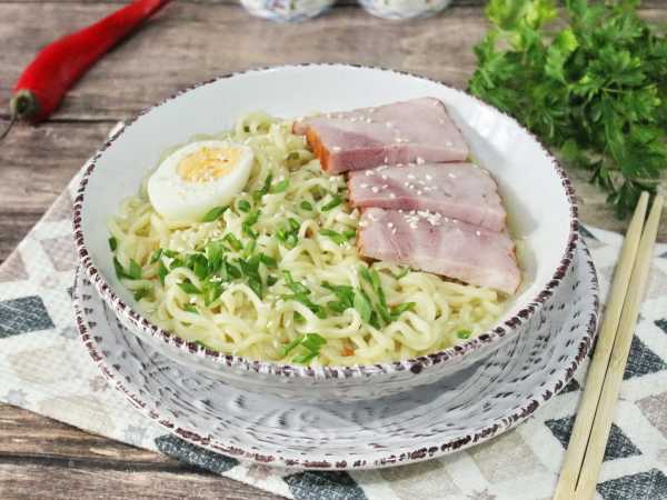 Соберите ингредиенты для приготовления рамена с ветчиной.