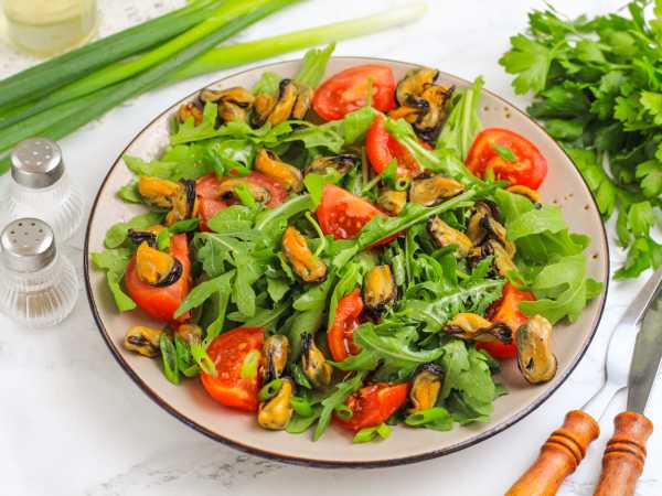 Яркий, легкий и питательный салат морепродуктами: креветками и кальмаров, с рукколой, маслинами, томатами черри, сладким перцем и огурцами.