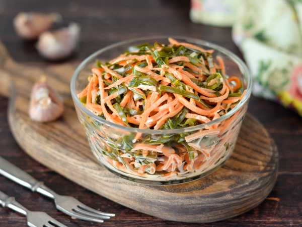 Очистите и сполосните морковь и чеснок. Морскую капусту откиньте на сито, чтобы стёк маринад.
