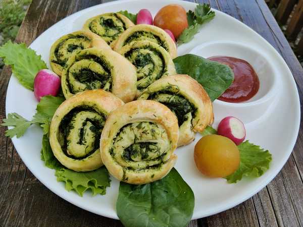 Хрустящие слойки готовятся за 25-30 минут. Смазывайте их взбитым яйцом для получения румяной корочки. Начинка может быть любой по желанию.