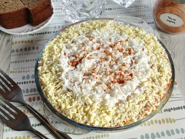 Салат «Мимоза» с жареным луком я готовила из такого набора продуктов.