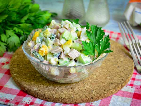 Классическая версия салата дополняется кисло-сладким или сладким фруктом, свежим огурцом. Блюдо получается более сочным и чуть сладковатым.
