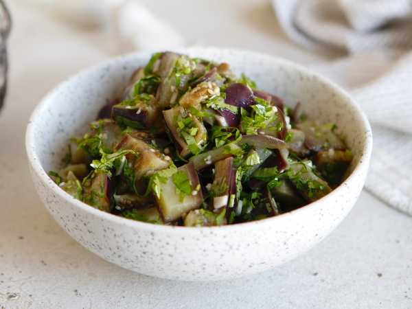 Нарезанные баклажаны засыпьте солью, чтобы избавить их от горечи. Затем отправьте в пароварку на 15 минут. Перед подачей полейте маслом.