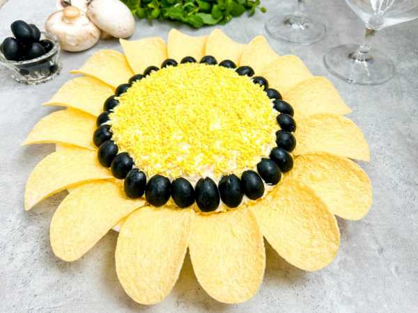 Соберите ингредиенты для приготовления салата «Подсолнух» с кукурузой, курицей и грибами.