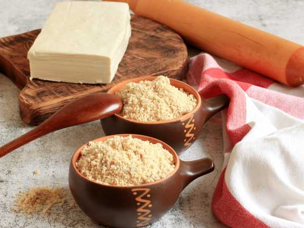 В тёплой воде развести дрожжи и сахар. Спустя 10 минут добавить манку и соль.