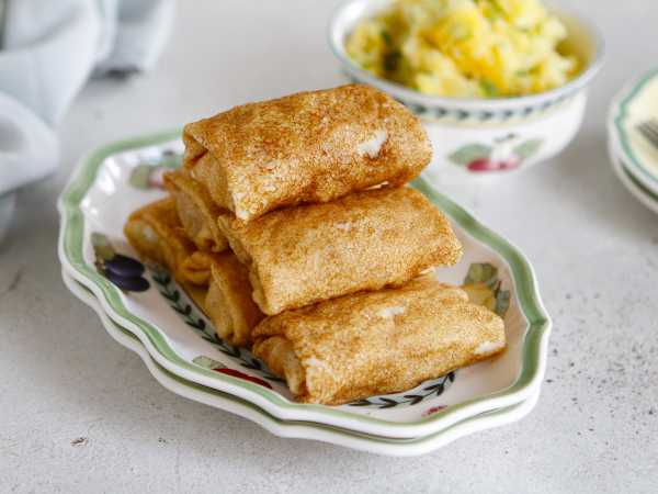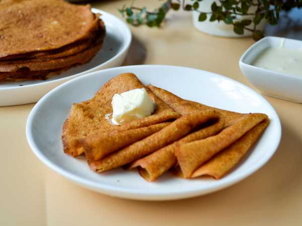 Готовим жидкое блинное тесто на муке и воде с добавлением пшеничной закваски. Затем на раскаленной сковороде выпекаем тонкие блинчики.
