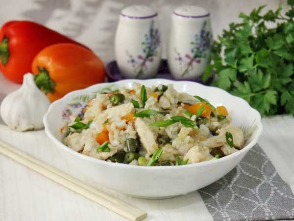 На сковороде обжаривают лук с морковью и зеленой фасолью, добавляют вареный рис, смешанный со взбитыми яйцами, жарят на тихом огне и подают.