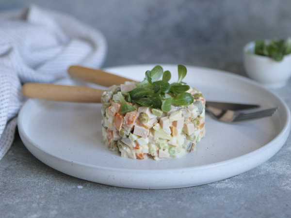 Салат "Оливье" без картошки и мяса относится к новым современным салатам. Картофель в нем очень удачно заменяет авокадо, а мясные продукты заменяет слабо соленая семга. Такой салат получается необычайно вкусным ...