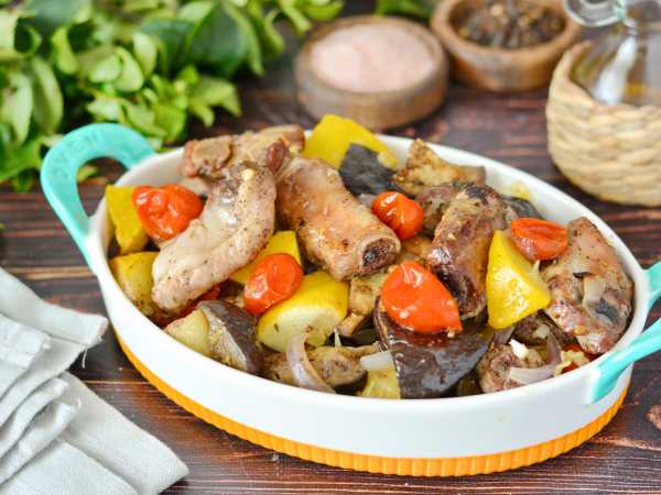 Основное блюдо (можно подавать без гарнира). Мясо подойдёт любое, но время приготовления может измениться. Овощи - сезонные.