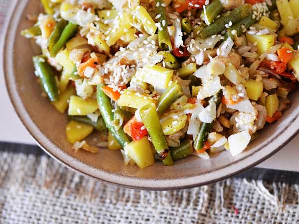 Картофель кратко обжаривают с луком и морковью, добавляют тыкву и репу, затем тушат с добавлением воды и приправ на тихом огне.