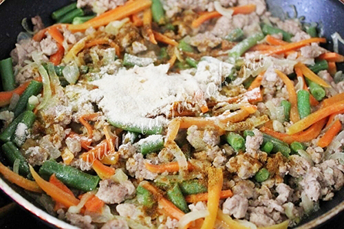 Загустите мукой мясоовощную начинку, добавьте куркуму или карри и перемешайте.