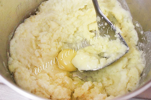 Сделайте пюре, добавьте в него молоко и яйцо и перемешайте.