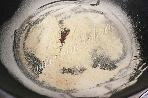 Муку обжарьте на сухой сковороде до золотистого цвета.