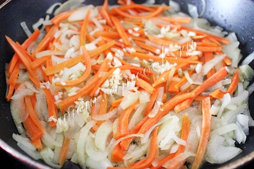 Лук, морковь и чеснок очистите. Лук нашинкуйте, морковь нарежьте соломкой и обжарьте их на растительном масле, добавьте рубленый чеснок и потушите минуты 3.