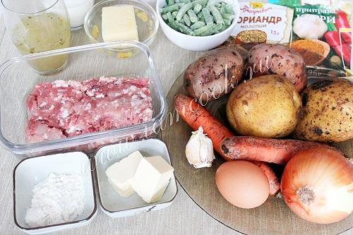 Для приготовления понадобятся такие продукты: картофель, морковь. лук, чеснок, бараний фарш (в моём варианте другой мясной фарш), горошек зелёный (или в моем варианте фасоль стручковая), сыр, бульон овощной или мясной, молоко, сливочное масло, яйцо, куркума или карри, кориандр, соль и растительное масло для жарки.