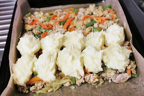 На противень смазанный маслом или застеленный пекарской бумагой уложите слой мясо-овощной начинки. Сверху сделайте слой из картофельного пюре, иногда его выдавливают красиво из кондитерского мешка ...