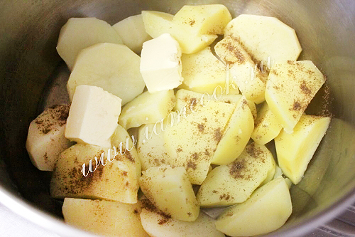 С картофеля слейте лишнюю воду, посолите, добавьте сливочное масло и кориандр.