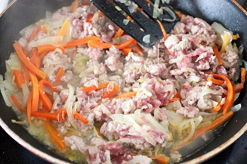 Затем влейте бульон, добавьте мясной фарш и потушите до готовности фарша.