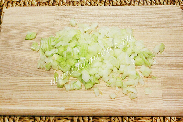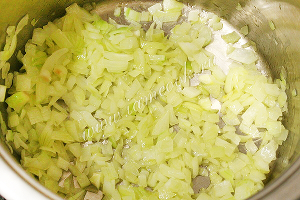 В кастрюлю с толстым дном налейте оливковое масло и обжарьте в нём лук до полупрозрачности.