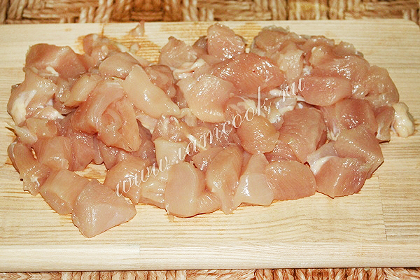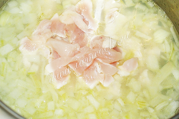 В обжаренный лук добавьте куриный бульон и доведите всё до кипения. Нарежьте куриные грудки небольшими кусочками.