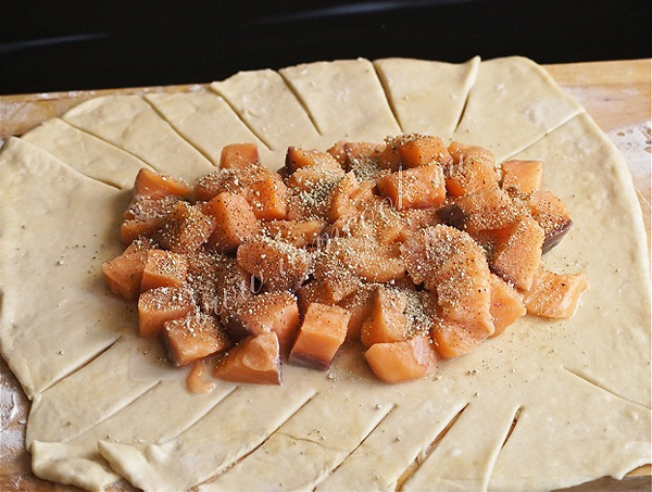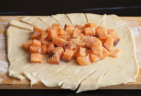 По краям теста сделать надрезы, как на фото. По центру выложить рыбную начинку.