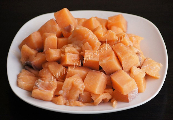 Филе красной рыбы аккуратно отделить от кожи при помощи острого ножа, извлечь обнаруженные на первый взгляд кости. Порезать филе форели небольшими кубиками и сбрызнуть оливковым маслом, а также приправить солью и черным молотым перцем по вкусу.