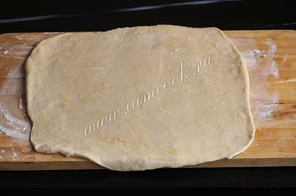 Отдохнувшее тесто раскатать на присыпанной мукой доске в пласт средней толщины, примерно 0,5 - 0,7 см.