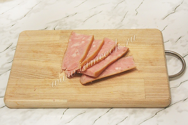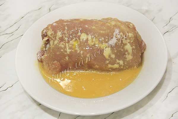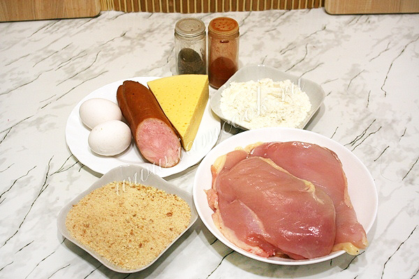 Ветчину положите на куриное филе. Сверху на ветчину выложите сыр.