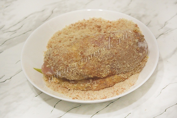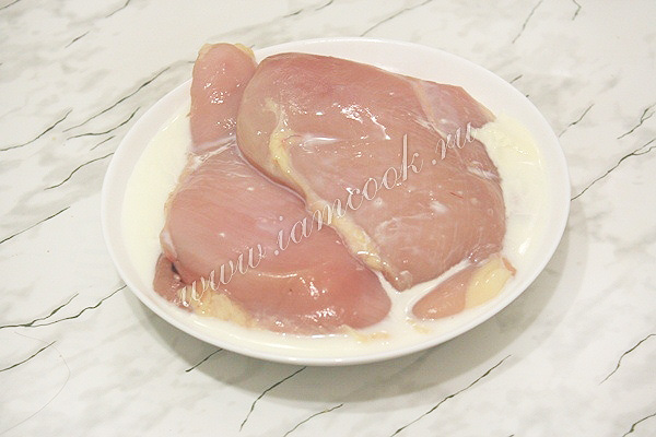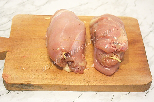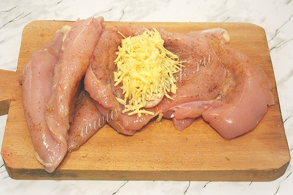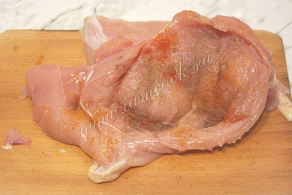 Разрежьте грудки пополам. Каждое филе надрежьте так, чтобы можно было его развернуть. Посолите филе и посыпьте приправами.