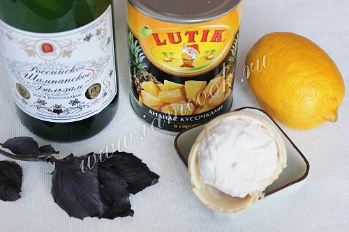Подготовьте шампанское, мороженое, консервированный ананас, лимон и свежие базилик или мяту.