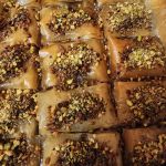 Готовую пахлаву достаем из духовки и сразу же поливаем ее обильно сиропом, чтобы он заполнил все разрезы. Оставляем пахлаву на несколько часов в противне, чтобы она пропиталась сиропом.