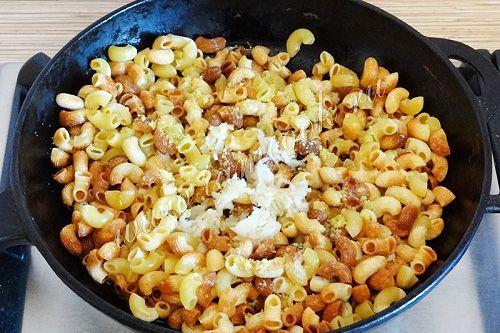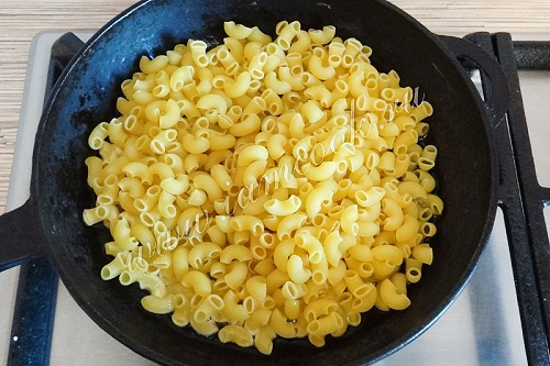 2. Разогреваем на сковороде масло, обжариваем макароны до легкого золотистого цвета в течение 3-5 минут.