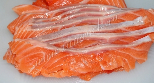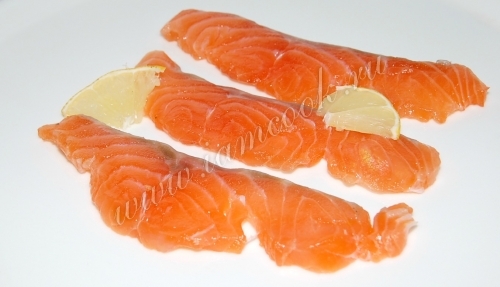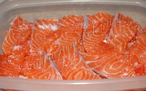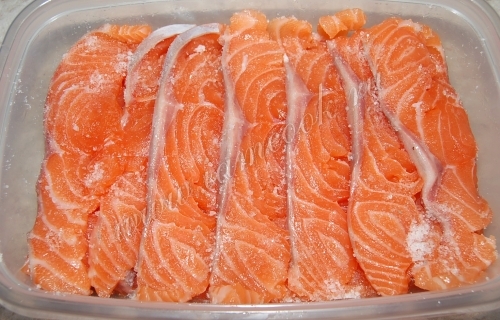 Рыба просаливается быстрее, уже через 1- 2 часа можно снимать первую пробу и наслаждаться, и к тому же, не надо пачкать руки и резать соленую рыбу, достаточно подцепить вилочкой понравившийся кусочек и положить его на хлеб. По вкусу можно добавить черный перец, укроп.
