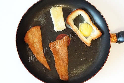 7. Перевернуть кусочки хлеба. В рамочку аккуратно вылить 1 яйцо.