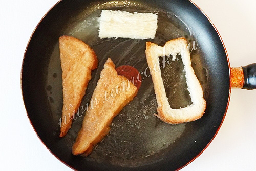 6. Разогреть на сковороде масло. Обжарить с одной стороны тосты, мякишь и хлебную "рамочку" до золотистого цвета.